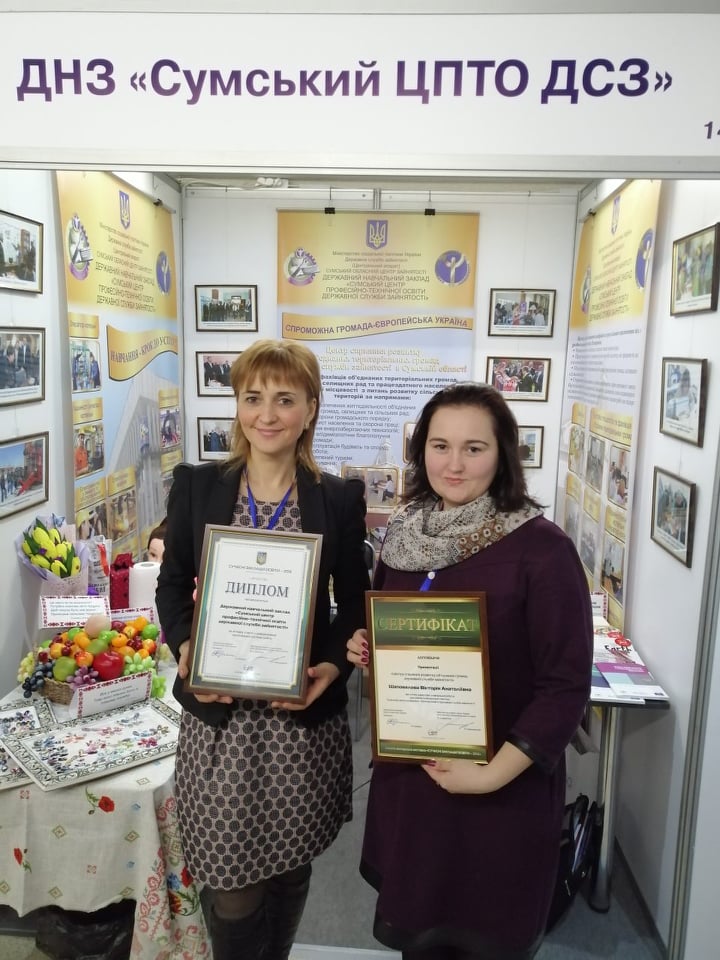 За активну участь у виставці у відповідних номінаціях ДНЗ «Сумський центр професійно-технічної освіти державної служби зайнятості» нагороджено дипломом учасника, почесною грамотою та вручено сертифікат про проведену презентацію!