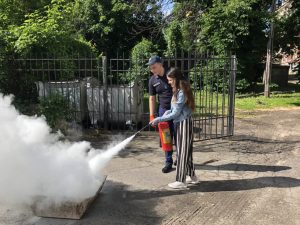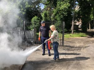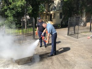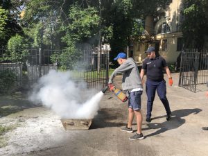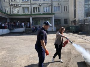 До участі у проведенні заняття був запрошений державний інспектор з нагляду (контролю) у сфері пожежної безпеки та техногенної безпеки у м. Суми Щербина В. С., який розповів про будову вогнегасника, типи вогнегасників та алгоритм дій при тушінні пожежі. Наступним кроком було відпрацювання роботи з вогнегасниками. В тушінні пожежі вправлялися слухачі центру з професій «Перукар (перукар-модельєр)», «Манікюрник», «Електрогазозварник», «Продавець продовольчих товарів» та представники двох напрямів навчання «Веб-дизайн» та «Основи малого підприємництва».