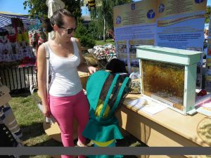 Наша демонстраційна зона була облаштована спостережним прозорим вуликом, нуклеусами, «штучною» бджолою, інвентарем та одягом бджоляра.